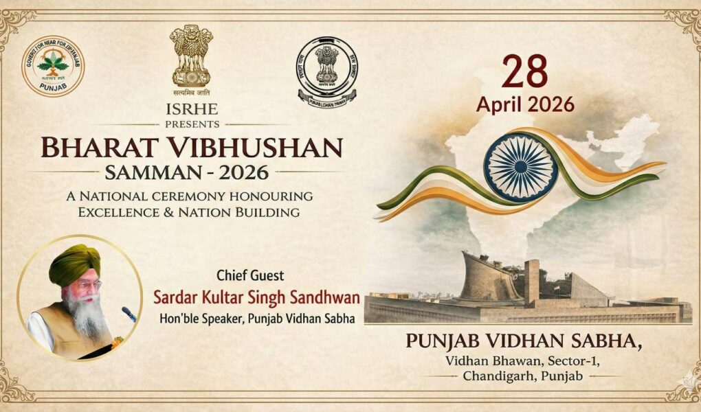 Chandigarh, Punjab: The Institute for Social Reforms and Higher Education Charitable Trust (ISRHE) has announced that it will host the prestigious Bharat Vibhushan Samman – 2026 on April 28, 2026, at the Conference Hall, Punjab Vidhan Sabha, Vidhan Bhawan, Sector-1, Chandigarh. The national ceremony is poised to bring together eminent personalities from across India in recognition of excellence, leadership and dedicated service towards nation building.