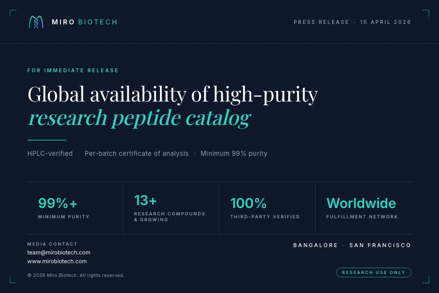 BANGALORE and SAN FRANCISCO, April 15, 2026. Miro Biotech today announced the global availability of its research-grade peptide catalog, extending HPLC-verified compounds to individual researchers, laboratories, and academic institutions across India, North America, Latin America, Europe, Africa, Asia-Pacific, and the Middle East.