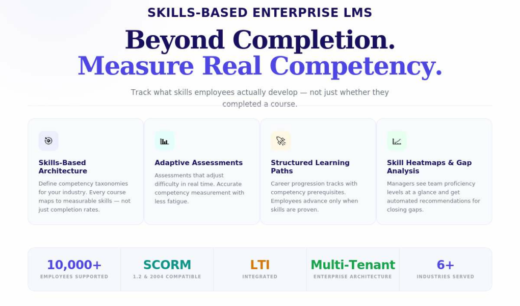 Enterprise LMS platform goes beyond completion tracking to measure actual competencies, enabling organizations to build skills-driven workforce development programs