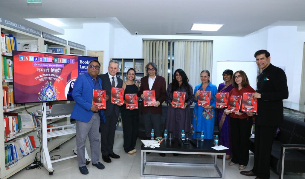 New Delhi – In a landmark event at Instituto Cervantes Delhi, a pioneering Hindi learning manual Namaste Hindi Part-1 was unveiled before an international audience. The launch was graced by H.E. Mr. Victor Martínez, Ambassador of Colombia; Ms. Maria Gil Burman, Director of Instituto Cervantes Delhi; Prof. (Dr.) Sonya Gupta, Former Director of Center for Spanish and Latin American Studies at Jamia Millia Islamia; senior diplomats from the Latin American region; leading academia; and prominent members of the press.
